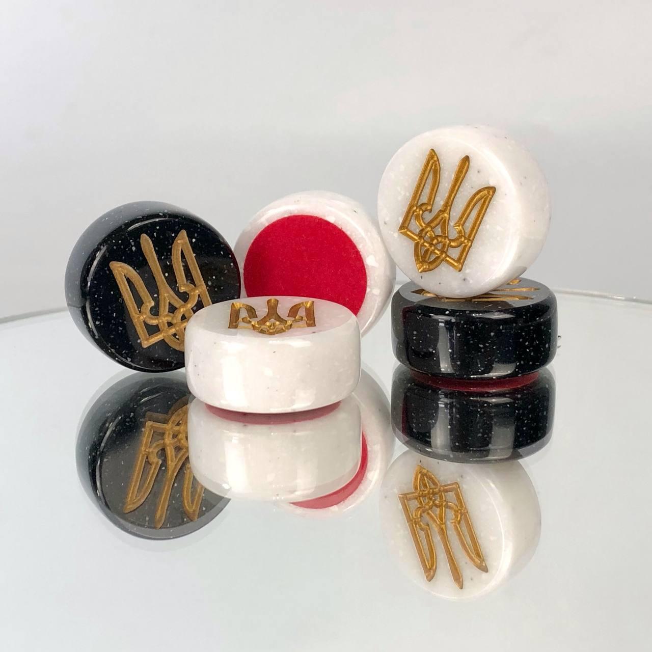 Преміальні фішки для нард виготовлені з акрилового каменю — міцного, зносостійкого матеріалу з гладкою поверхнею. У центрі кожної фішки нанесено гравіювання у вигляді українського тризуба, що символізує силу, єдність і гордість за країну.