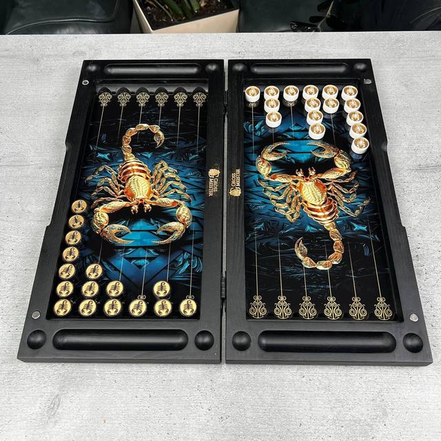 Каркас виготовлений із натурального ясеня, що додає нардам благородного вигляду й приємного тактильного відчуття. Фішки з акрилового каменю прикрашені різьбленим зображенням скорпіона — це не лише естетика, а й символ сили, інтелекту та витримки. Під час гри приємний дзвінкий стукіт фішок об скло створює особливу атмосферу — відчуття азарту, яке захоплює з першої партії.
